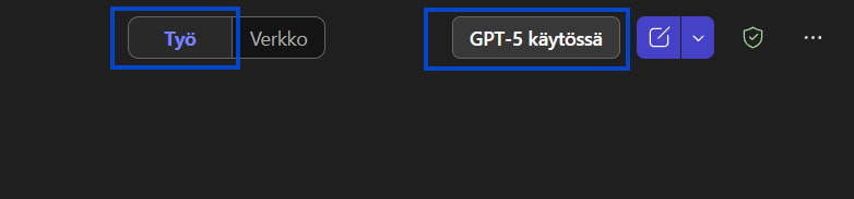2. Varmistan, että minulla on Work/Työ aktivoituna Copilot Chat:ssa, sekä GPT-5 on päällä. (Vinkki: jos GPT-5 ei näy oikeassa yläkulmassa, kokeile klikata kolmea pistettä – se saattaa löytyä sieltä.)