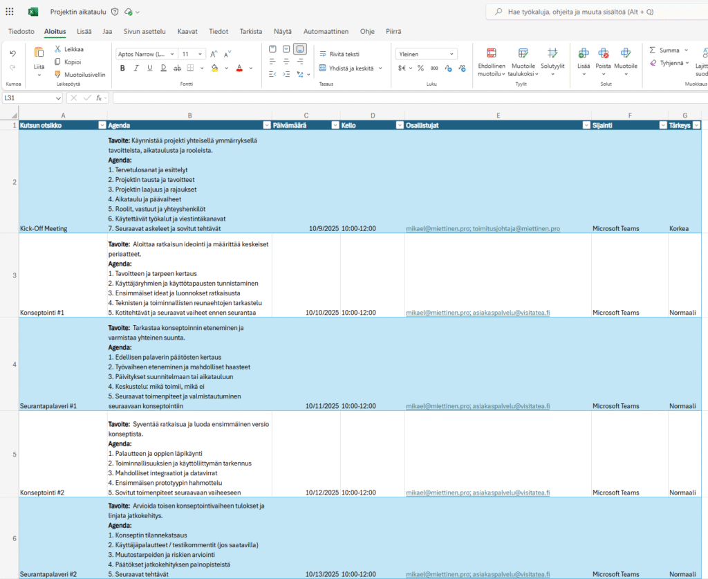 Otin tähän kuvitteellisen tapauksen, jossa pitää lähettää 10 projektipalaveria sekä, että ulkoisille henkilöille. Excel näyttää tältä: