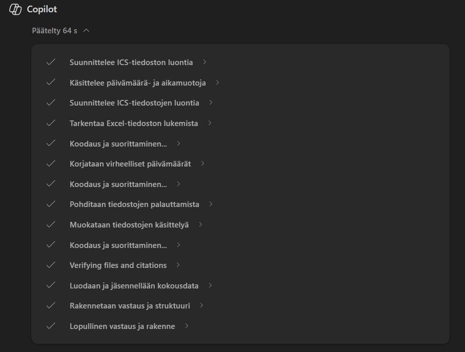 Tässä vaiheessa Copilot lähtee pohtimaan kehotetta ja toteuttamaan pyytämiäni kalenterikutsuja. Päättelyssä menee vain 64 sekuntia: