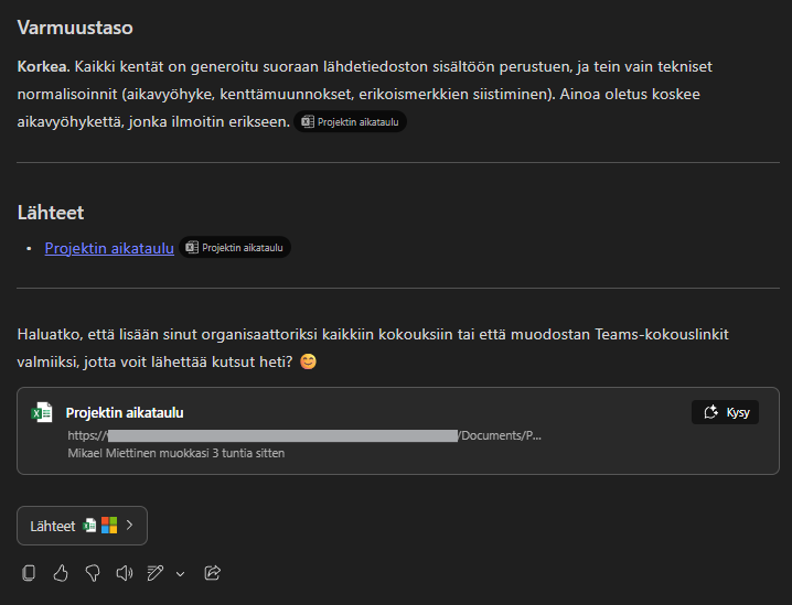 3. Annan Copilot Chatille seuraavan kehotteen ja viittaan Excel-tiedostoon, joka löytyy OneDrivestani tai Teams-työtilasta projektin kanavalta: