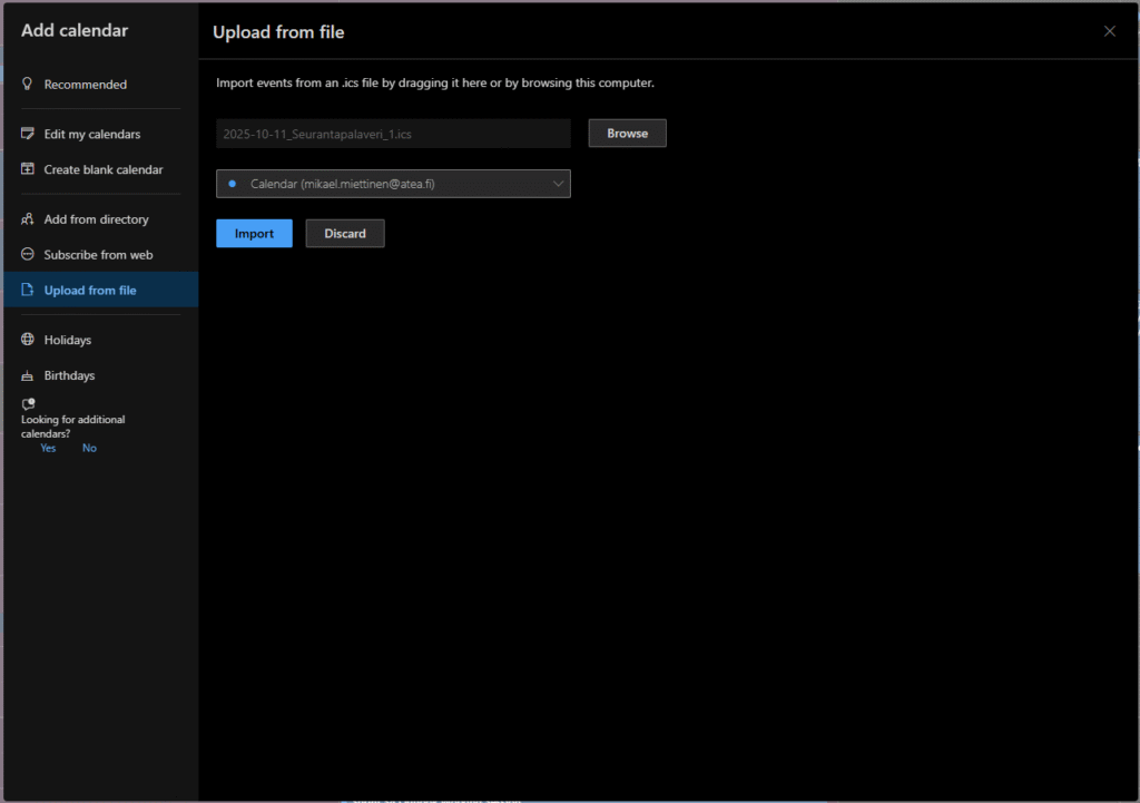 5. Avaan Outlookissa kalenterin ja tuplaklikkaan .ics-tiedostoja toisessa ikkunassa, jolloin voin lisätä ne kalenteriini (tällä hetkellä yksi kerrallaan – ainakin uudessa Outlookissa) klikkaamalla Import: