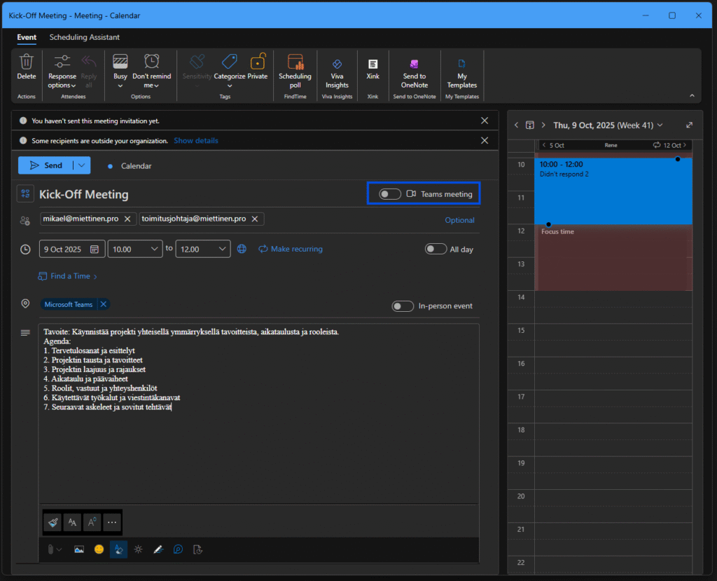 6. Lopuksi avaan tapahtuman kalenteristani, laitan Teams meetingin päälle (sininen boxi kuvassa alla) ja lähetän kalenterikutsun.