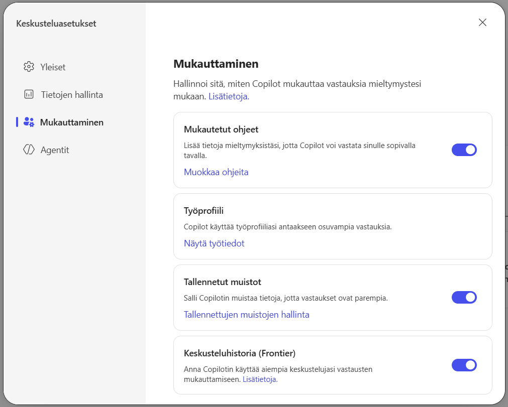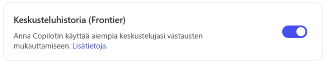 – Keskusteluhistoria (Frontier): Anna Copilotin käyttää aiempia keskustelujasi vastausten mukauttamiseen