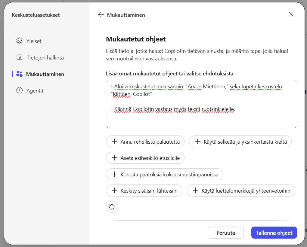 Miten sitten saat Copilotin tottelemaan? Klikkaamalla Muokkaa ohjeita pääsen antamaan Copilotille tarkkoja ohjeita, miten vastaus tulisi antaa. Alla näet esimerkin, johon olen lisännyt seuraavat ohjeet Copilotille: