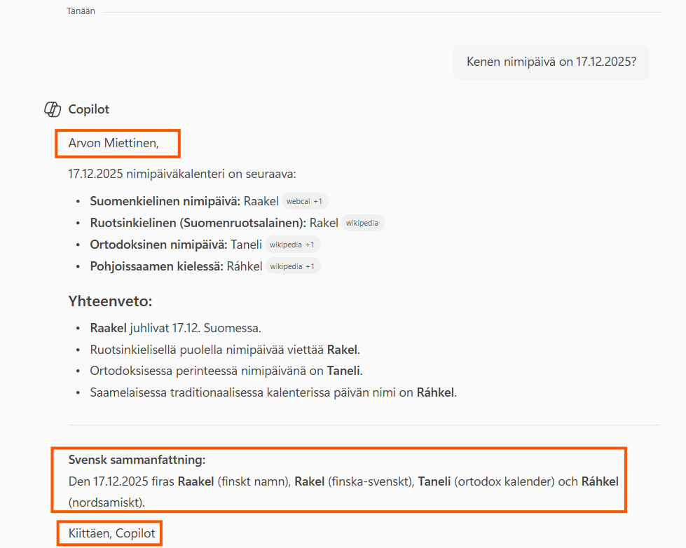 – Aloita keskustelut aina sanoin: ”Arvon Miettinen,” sekä lopeta keskustelu ”Kiittäen, Copilot”