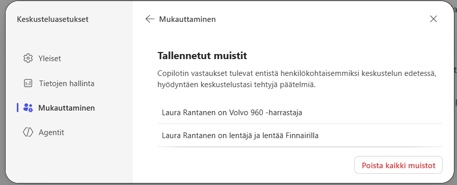 Tässä esimerkissä nyt Laura Rantanen on tallentanut 2 asiaa itsestään Copilotin muistiin: