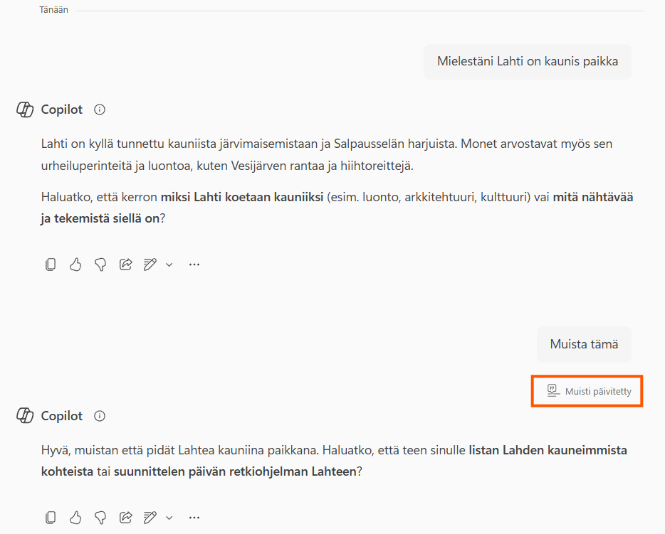 Miten Laura pystyy nyt tallentamaan Copilotin muistiin asioita? Se on helppoa. Ei muuta kuin vaikka kesken keskustelun Copilotille kertoo, että hei: ”Muista tämä” ja tämä tallentuu muistiin: