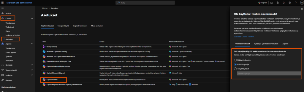 Tämä on uusin kohta jota voi hyödyntää ja tämä vaatii sen, että organisaation IT on joko asettanut sinulle tai kaikille Copilot lisenssin omaaville Frontier -toiminnallisuuden käyttöön Microsoft 365 Admin Centeristä. Suora linkki tähän asetukseen löytyy tästä. Asetuksen muuttaminen vaatii AI Administrator- tai Global Administrator -oikeudet ympäristössä.