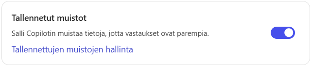 Tämän voit halutessasi myös täpätä pois päältä, jos et halua, että Copilot tallentaa mitään muistoja sinusta. (En suosittele täppäämään pois päältä, vaan pitämään päällä)