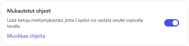 Tämän voit halutessasi myös täpätä pois päältä, jos et halua antaa Copilotille mukautettuja ohjeita. (En suosittele täppäämään pois päältä, vaan pitämään päällä)